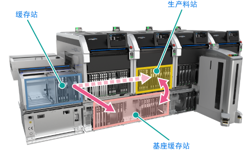 在由NXTR構成的生產線內,只要緩存站內備有必要的供料器,智能加載車便會按照料盡或換線的生產計劃自動將生產料站上的供料器換成緩存站內的供料器。